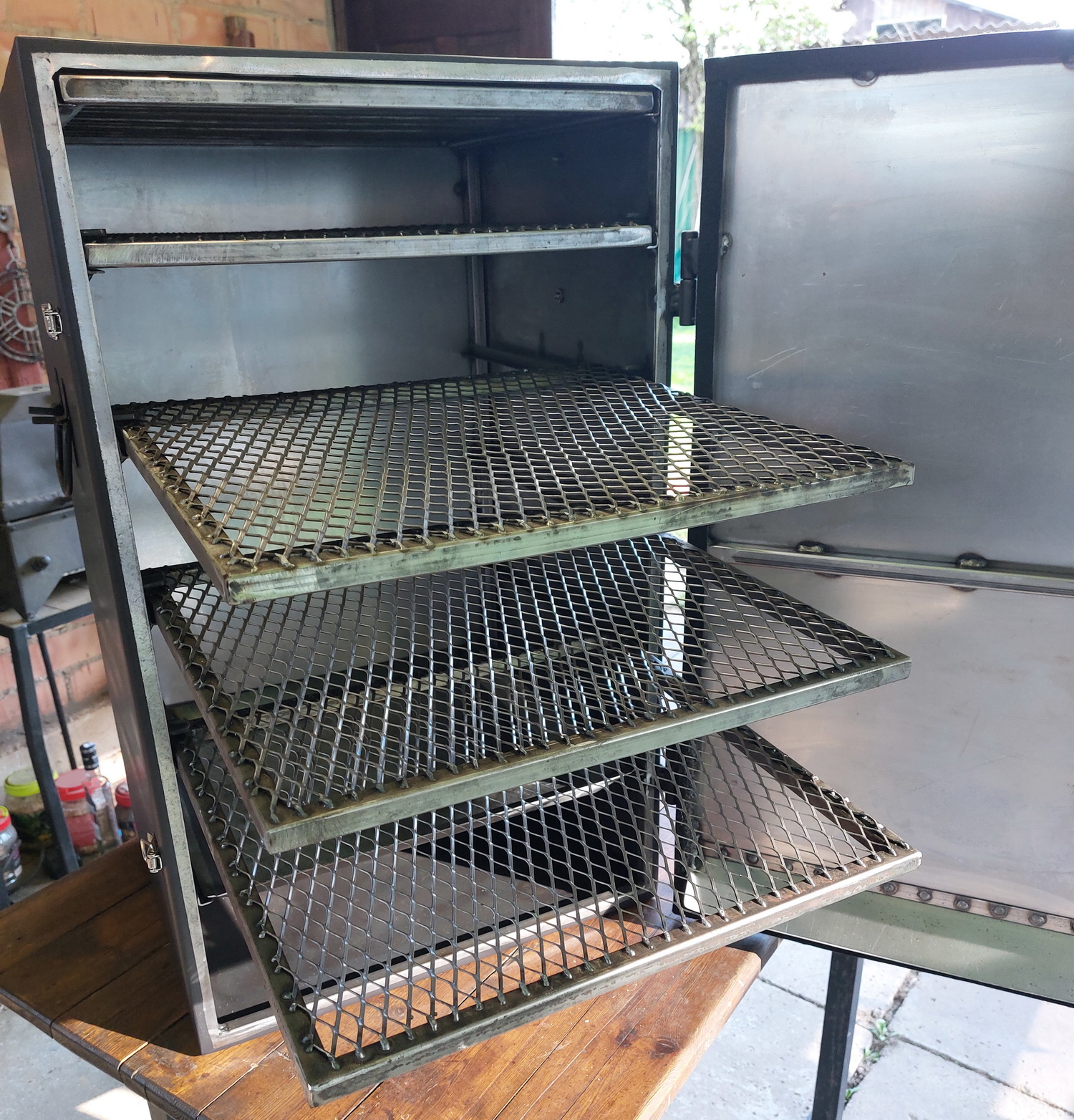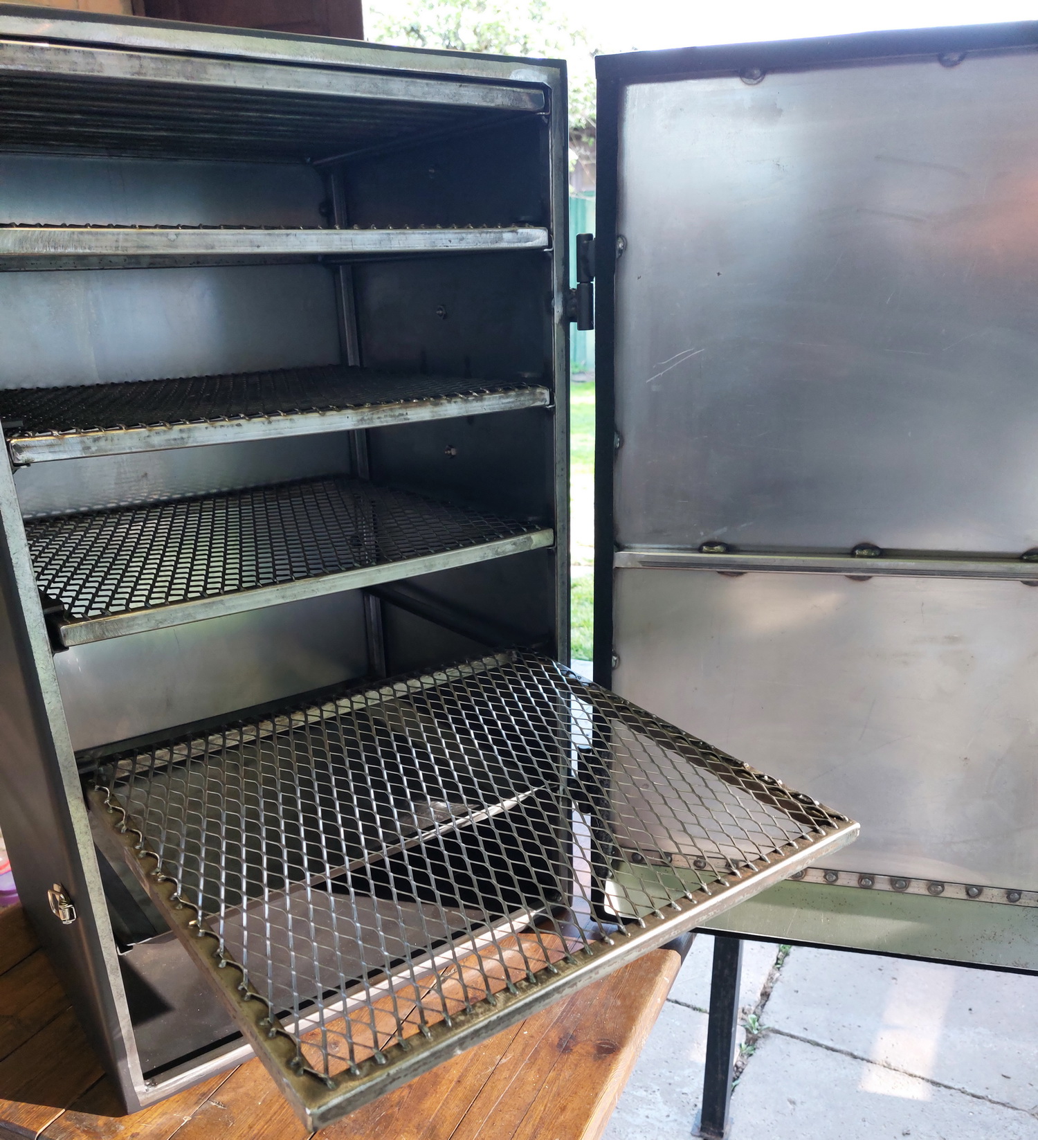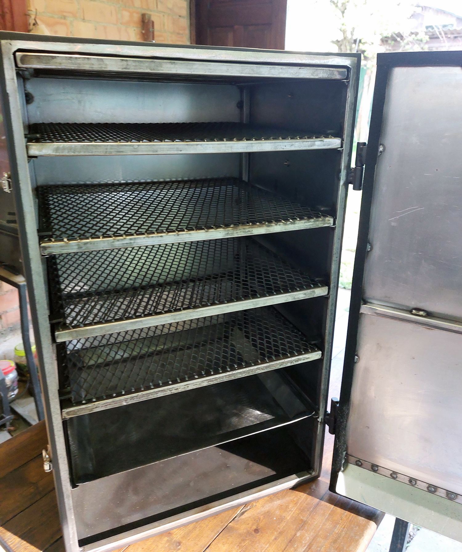Прогреть второй раз, можно прокоптить, чтобы внутри появилось черное покрытие (не маркое). при этом, решетки, смазать льняным маслом и хорошенько прогреть вместе с коптильней.